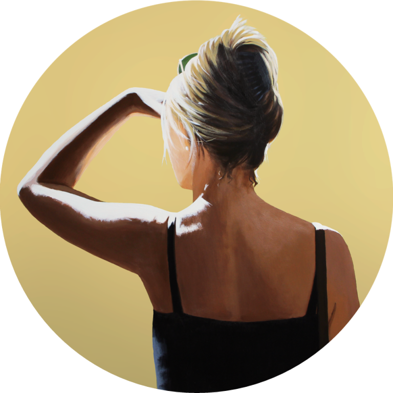Ihre fotorealistischen Gemälde sind keine Portraits, vielmehr bieten sie Kulisse und Projektionsfläche für die eigene Phantasie: Betrachter und Umgebung spiegeln sich - mehr oder weniger dezent - im glänzenden, monochromen Malgrund und beleben die dargestellte Szenerie spontan zu einem ganz individuellen, persönlichen Motiv.